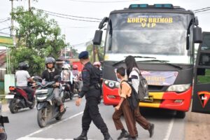Satbrimob Polda Kalbar meluncur program bis sekolah gratis bagi pelajar guna memudahkan akses transportasi mereka berangkat ke sekolah. Jum’at (24/10/25).