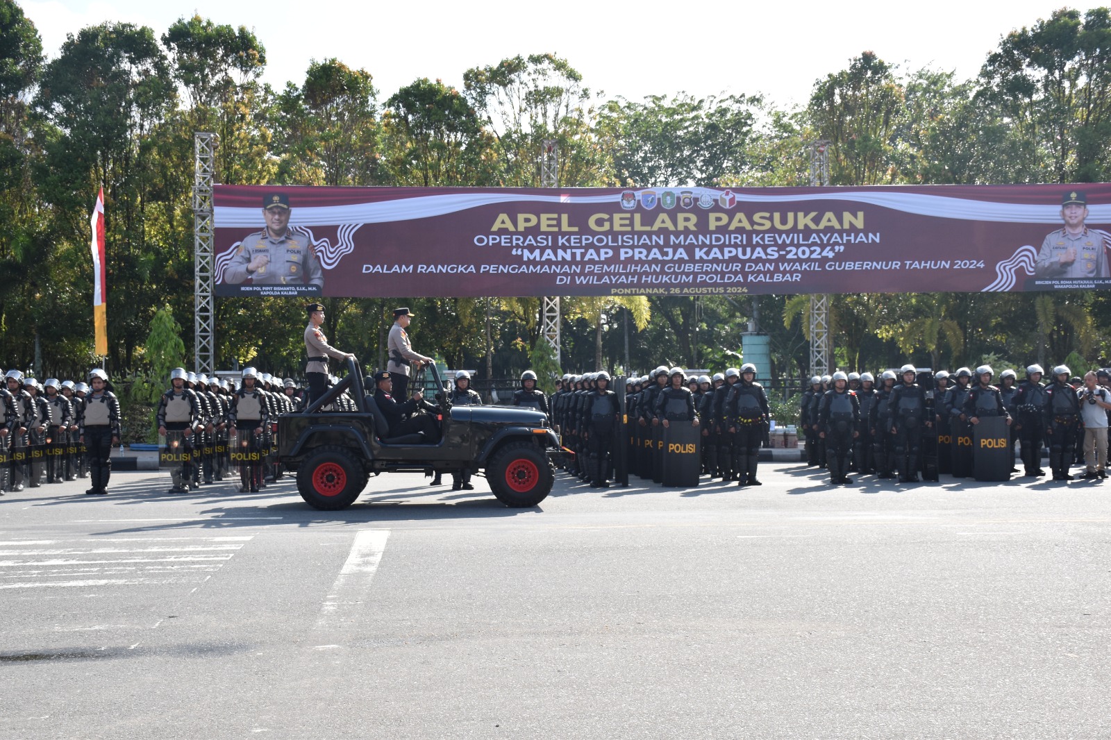 Kapolda Kalbar Irjen Pol. Pipit Rismanto, S.I.K., M.H. memimpin langsung pelaksanaan Apel Gelar Pasukan Operasi Kepolisian Mandiri Kewilayahan Mantap Praja Kapuas 2024 di alun-alun Kapuas, Kota Pontianak. Kegiatan apel gelar ini dihadiri seluruh pejabat utama Polda Kalbar termasuk Dansatbrimob Polda Kalbar Kbp Irwan Jaya, S.I.K. sebagai perwira apel, pejabat utama Kodam XII/Tpr, Pj. Gubernur Provinsi Kalbar, Pj. Walikota Pontianak, Ketua Bawaslu Provinsi Kalbar serta diikuti oleh seluruh personel Polda Kalbar dan personel Kodam XII/Tpr serta stakeholder yang terlibat didalam pengamanan pesta demokrasi tahun 2024 diwilayah hukum Polda Kalbar. Apel Gelar pasukan hari ini merupakan pengecekan dan persiapan akhir yang dilakukan oleh Polda Kalbar untuk mengecek kesiapan seluruh personel, peralatan dan strategi yang nantinya akan diterapkan pada saat mengamankan jalannya tahapan Pilkada tahun 2024 diwilayah hukum Polda Kalbar. Selain bertugas sebagai garda terdepan dalam menjaga keamanan dan ketertiban selama Pilkada penting untuk memastikan seluruh anggota Polri memiliki komitmen penuh untuk menjaga netralitas dan menjaga independensi serta Polri harus berdiri harus berdiri diatas kepentingan nasional.