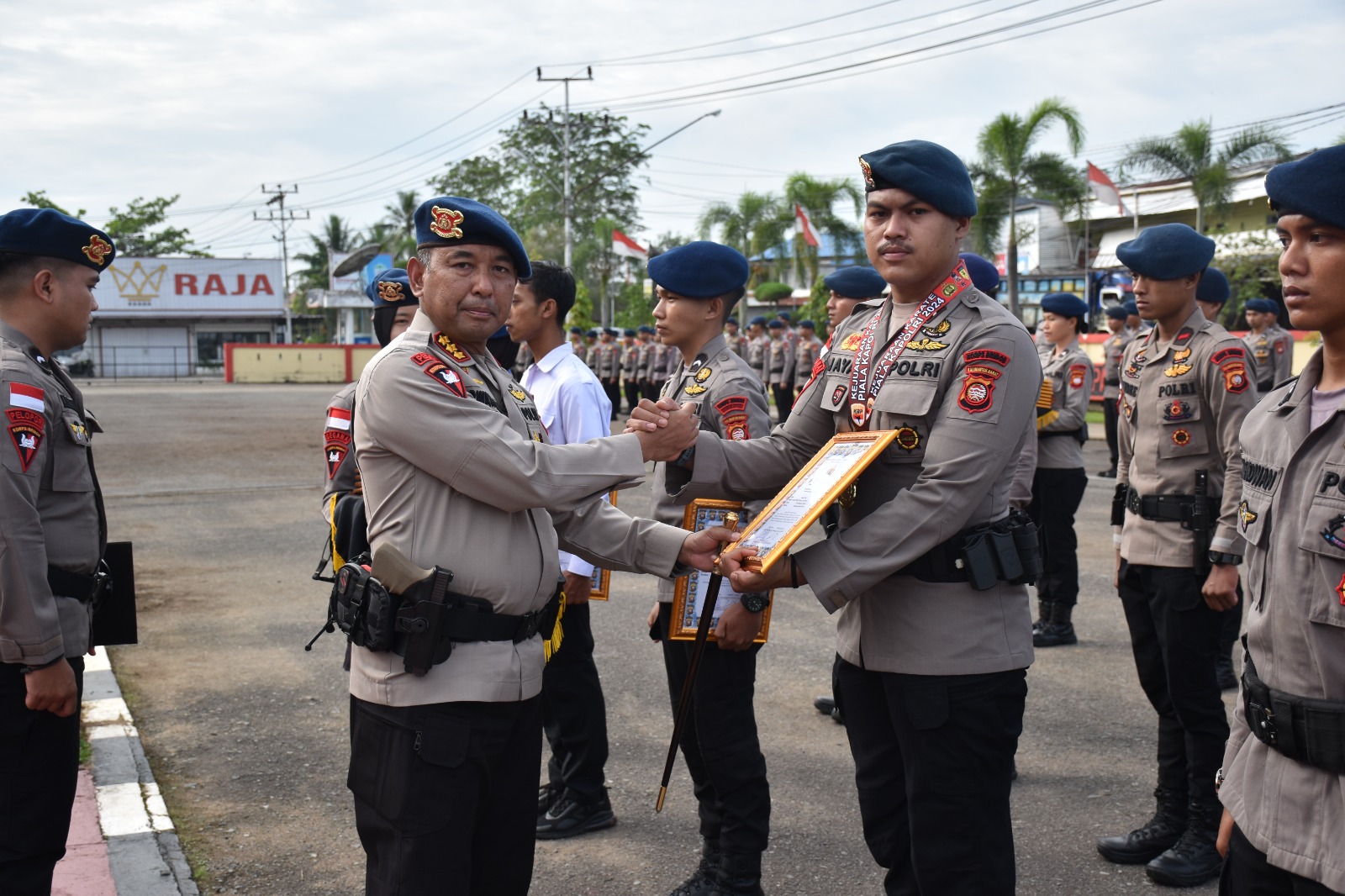 Dansatbrimob Polda Kalbar memimpin langsung apel penyerahan penghargaan kepada personel Satbrimob Polda Kalbar yang berprestasi. Selasa (18/03/25).