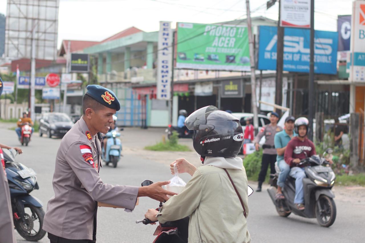 Satbrimob Polda Kalbar kembali laksanakan berbagi takjil dengan sasaran masyarakat muslim pengguna jalan di Kota Singkawang. Selasa (11/03/25).
