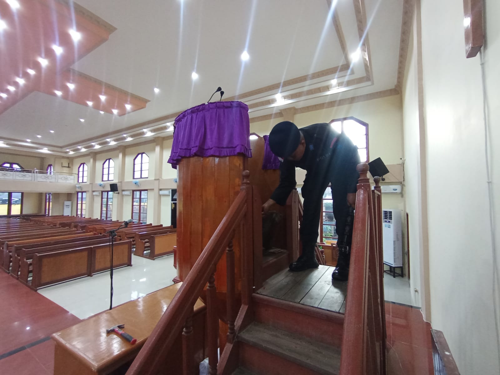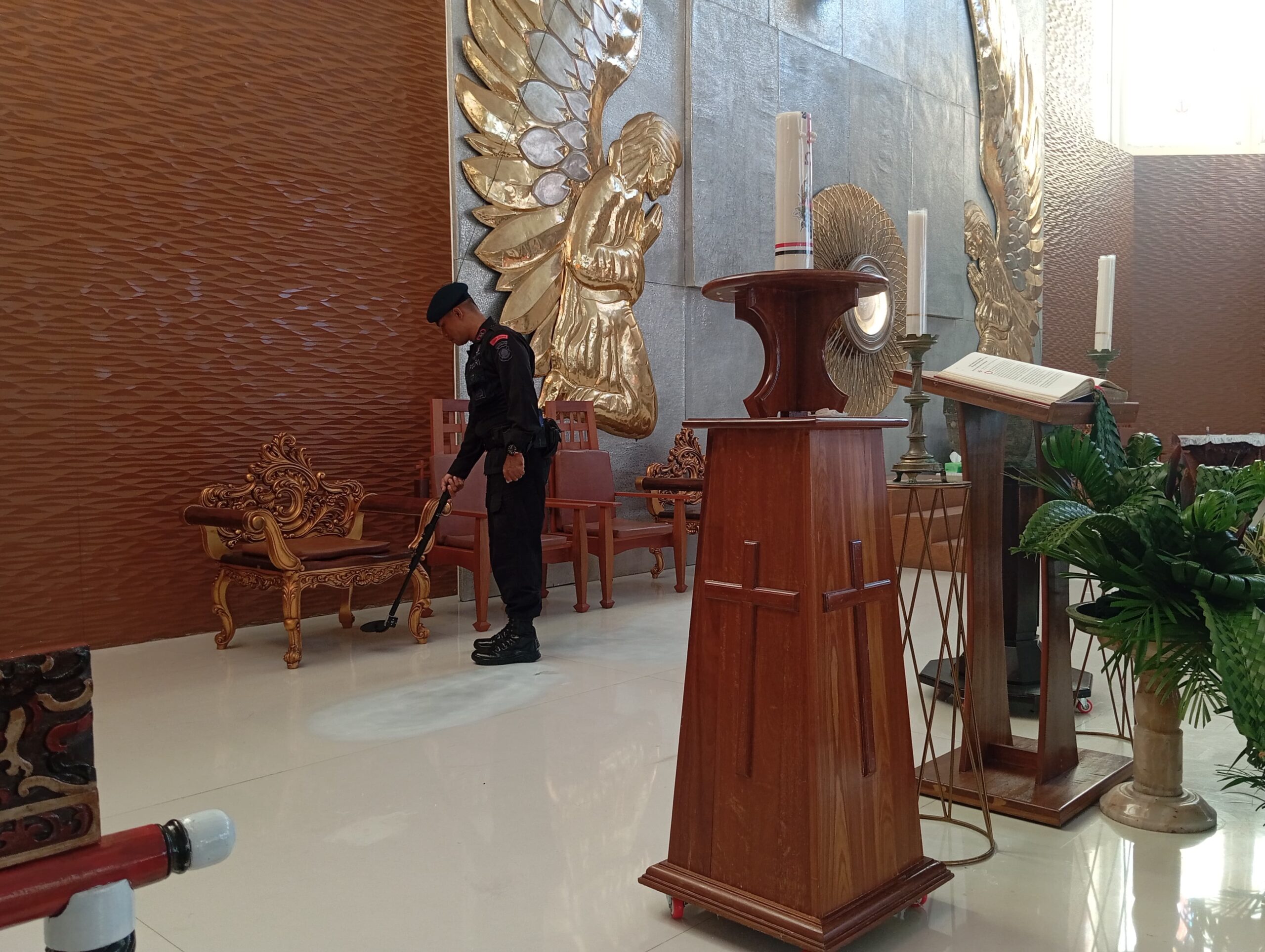 Sterilisasi Satbrimob Polda Kalbar Pastikan Keamanan Selama Ibadah Misa Jum’at Agung Berlangsung