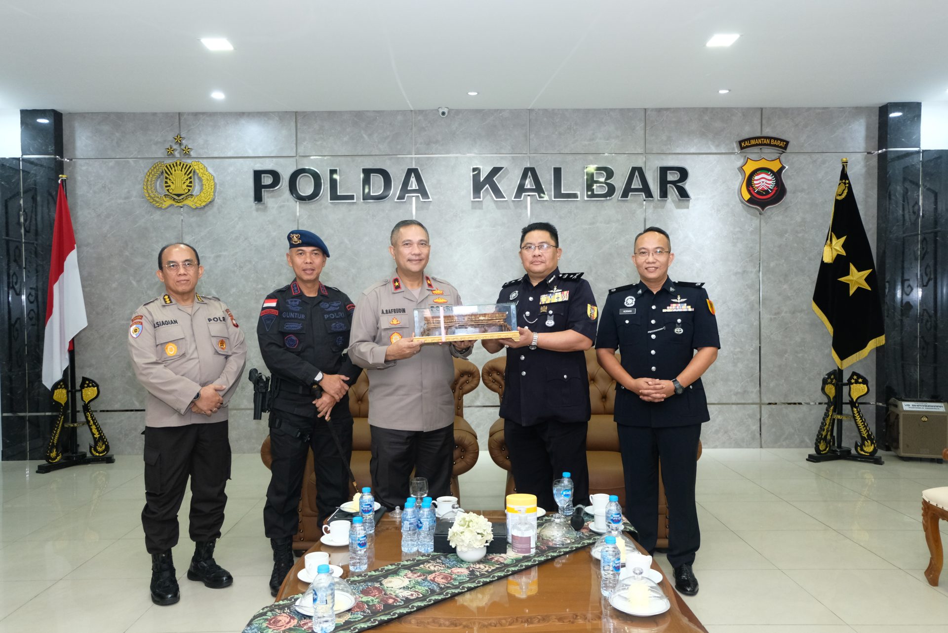 Dansatbrimob Polda Kalbar Kbp M. Guntur, S.I.K., M.H. besrsama dengan para pejabat utama Satbrimob Polda Kalbar mendampingi Wakapolda Kalbar Brigjen Pol. Asep Safrudin, S.I.K. menerima kunjungan silaturahmi dari rombongan Delegasi Ibu Pejabat Briged Sarawak Pasukan Gerakan AM (PGA) Malaysia di Mapolda Kalbar. Kegiatan kunjungan silaturahmi yang dilaksanakan oleh rombongan Delegasi Ibu Pejabat Briged Sarawak Pasukan Gerakan AM (PGA) Malaysia pada hari ini adalah untuk mempererat tali silaturahmi antara Polri dan Polis Kerajaan Malaysia. Perlu kita ketahuai Briged Sarawak Pasukan Gerakan AM (PGA) Malaysia ini merupakan pasukan khusus yang dimiliki oleh Polis Kerajaan Malaysia yang bertugas untuk menghadapi dan menindas semua jenis ancaman berintensitas tinggi (pemberontakan bersenjata) di Malaysia serta membantu tugas Angkatan Tentera Malaysia untuk menentang grilia komunis dan mencegah masuknya musuh ke negara mereka. Komander Briged Sarawak PGA SAC Dr. Che Ghazali Bin Che Awang selaku komandan dari Pasukan Gerakan AM (PGA) Malaysia mengucapkan banyak terimakasih atas jamuan yang telah ditunjukan oleh Polda Kalbar kepada rombongan mereka pada hari ini. Komander Briged Sarawak PGA SAC Dr. Che Ghazali Bin Che Awang juga berharap semoga kunjungan silaturahmi rombongan Delegasi Ibu Pejabat Briged Sarawak Pasukan Gerakan AM (PGA) Malaysia ke Polda Kalbar pada hari ini dapat mempererat hubungan antara Polri dan Polis Kerajaan Malaysia.