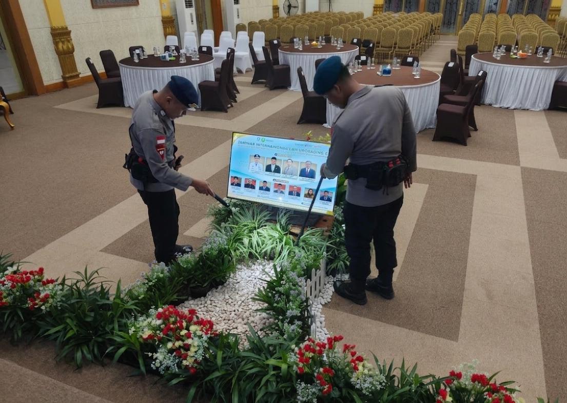 Satbrimob Polda Kalbar lakukan sterilisasi berikan rasa aman dan nyaman kepada peserta dan Delegasi 6 Negara di kegiatan Seminar Internasional dan Upgrading Da’i. Rabu (08/04/26).