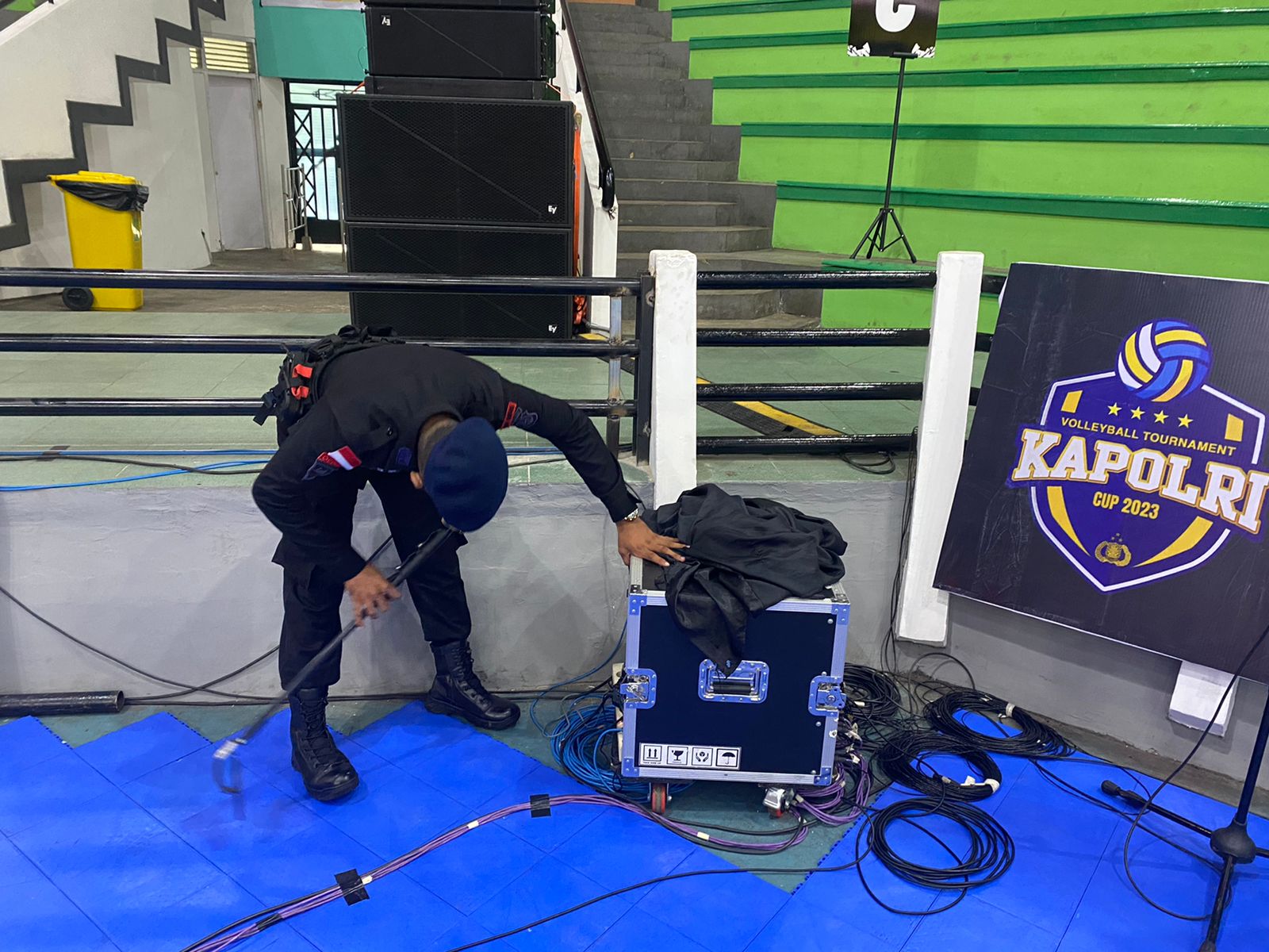 “Kegiatan sterilisasi yang sedang kami lakukan ini merupakan salah satu persiapan yang kami lakukan untuk memberikan rasa aman dan nyaman kepada masyarakat maupun para pejabat tamu undangan yang ingin menonton pertandingan Volleyball Tournament Kapolri Cup 2023 disini. Selain melakukan sterilisasi dikegiatan Volleyball Tournament Kapolri Cup 2023 ini kamu juga menempatkan beberapa personel disetiap pintu masuk dengan tujuan untuk melakukan pengecekan terhadap barang bawaan para yang dibawa oleh penonton. Kami juga menghimbau kepada para penonton untuk tetap waspada terhadap barang bawaan mereka serta menghimbau mereka untuk tidak menggunakan aksesoris atau perhiasan berlebihan yang itu bisa membuat mereka menjadi target sasaran oknum masyarakat yang ingin melancarakan aksi kejahatan mereka” ucap Akp Sri Rubianto.