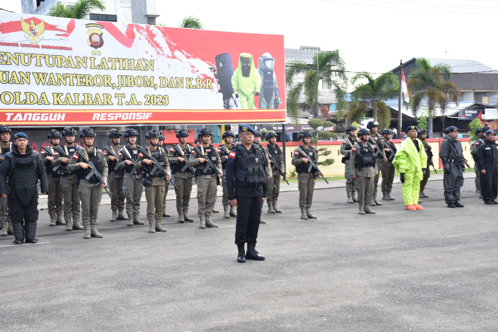 Upacara penutupan latihan peningkatan kemampuan Wanterror, KBR (Kimia Biologi Radioaktif) dan Jibom Satbrimob Polda Kalbar. Jum’at (26/05/23).